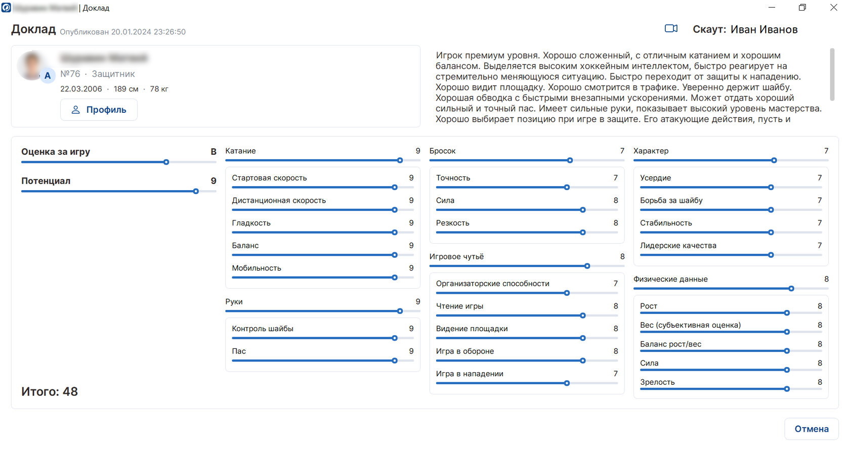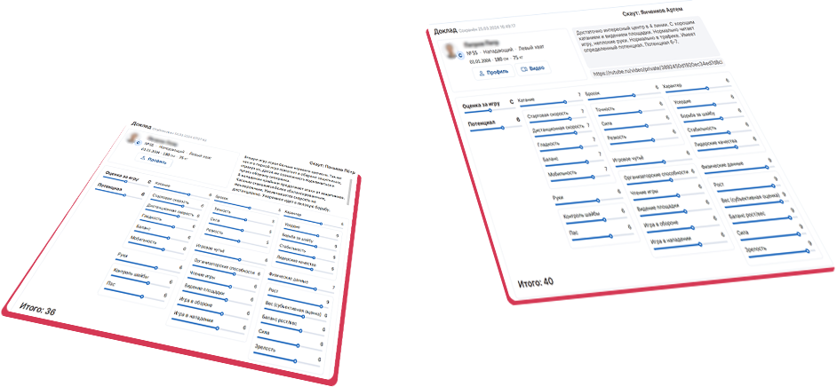 скаутский отчет, включающий оценку по более чем 20 параметрам, а также оценку перспектив